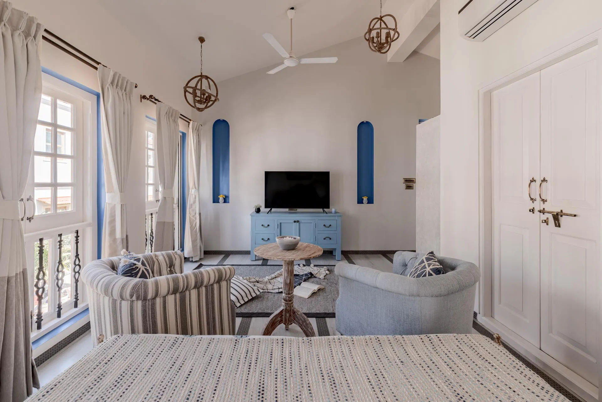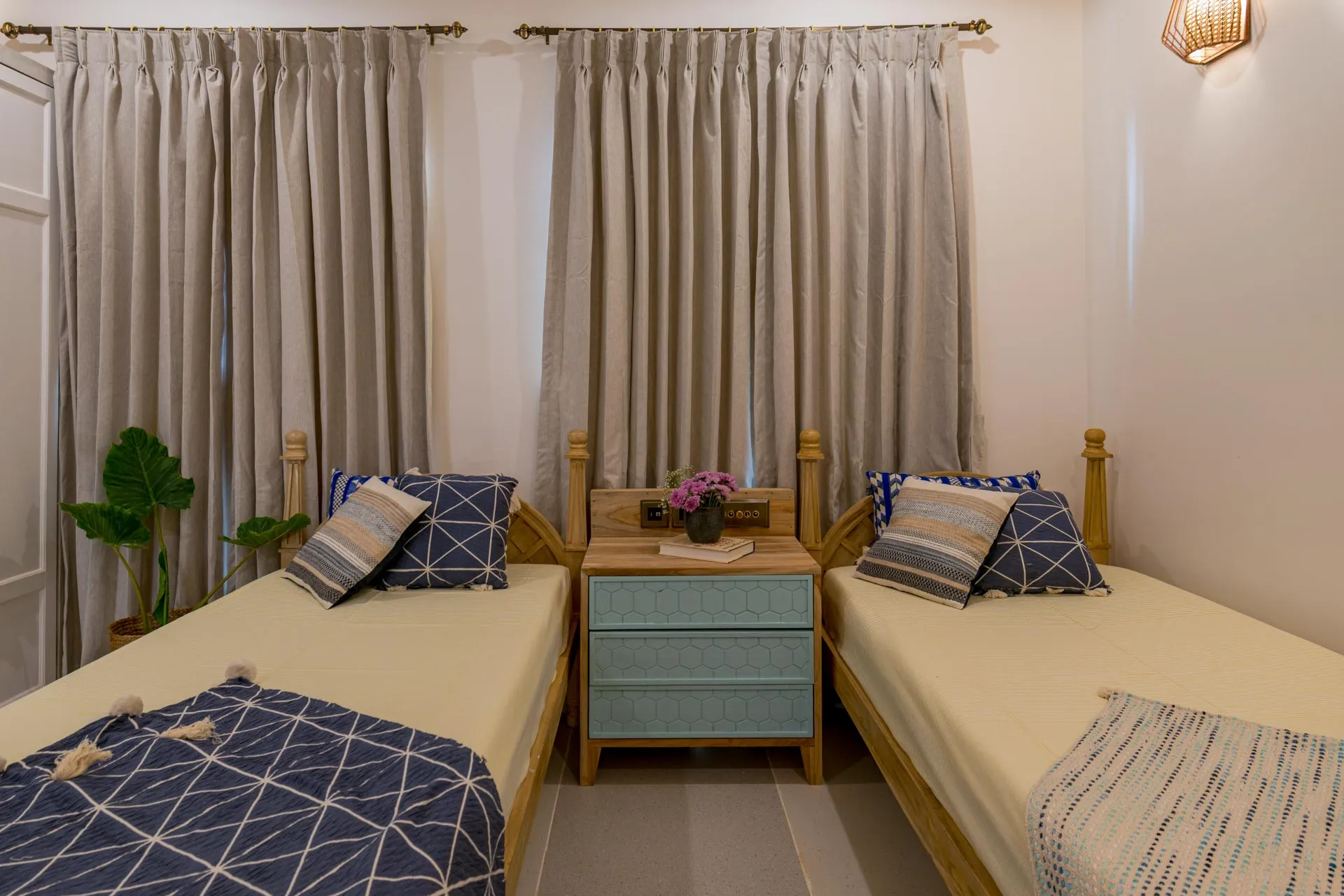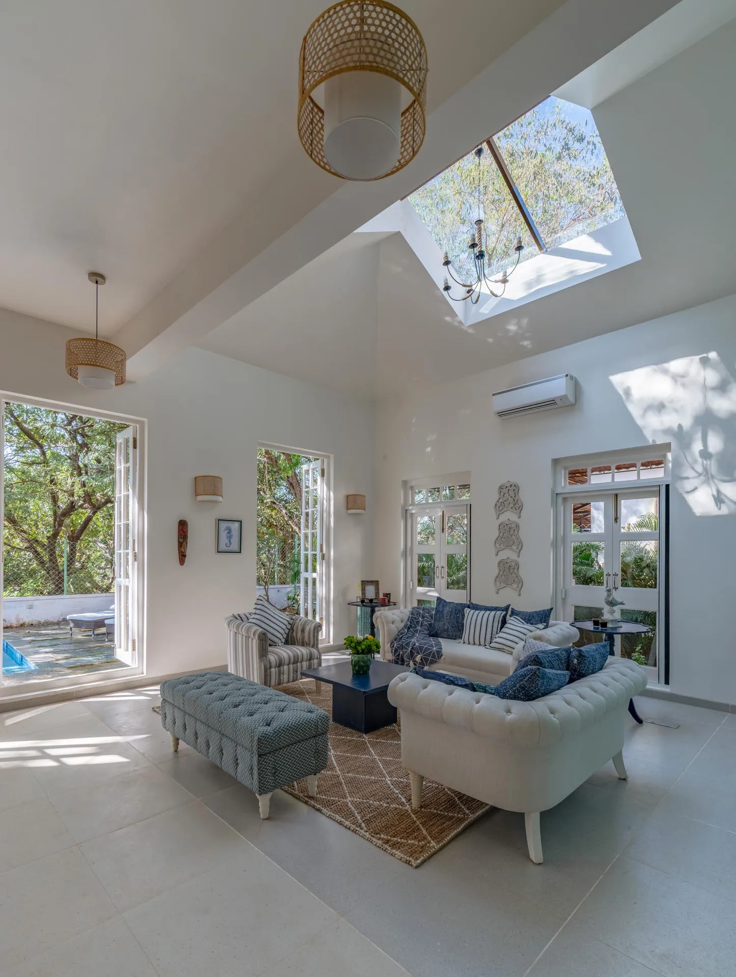 Villa D of Isprava’s gated community, Colina, exemplifies the Mediterranean design style and emphasises the indoor-outdoor living connect. The interiors are soothing with a primarily neutral grey-white colour palette, brought to life with blue accents. The large glass doors and windows of this Goan-Portuguese home, along with the stunning skylight in the living area, let in ample natural light and allow you to take in the lush green foliage. The dining area that opens out onto the private pool area, is perfect for a dinner soirée while the terrace, fitted with its own bar, is where you can enjoy your aperitifs. The 3 cozy bedrooms and den offer homely comforts and the best amenities for you to relax and unwind. Colina is truly a haven for city-dwellers. No two luxury homes here are alike and yet they maintain a beautiful sense of harmony. You can book multiple villas in the community for larger groups, while enjoying the privacy within your own villa. Conveniently located in Assagaon, Goa’s trendiest cafés and restaurants are right at your doorstep while the pristine beaches of Ashvem and Mandrem are just a short drive away.