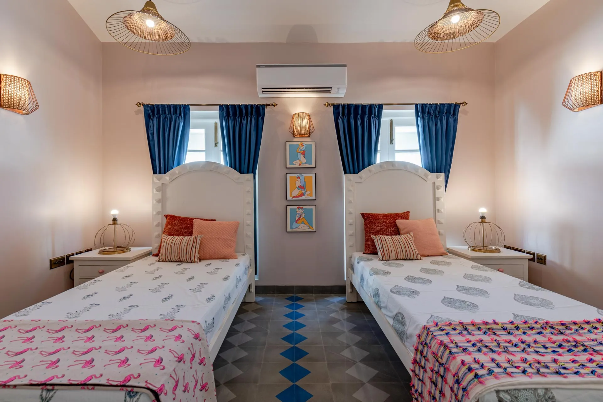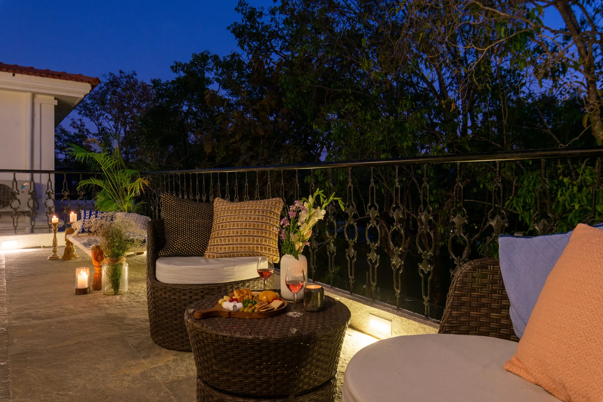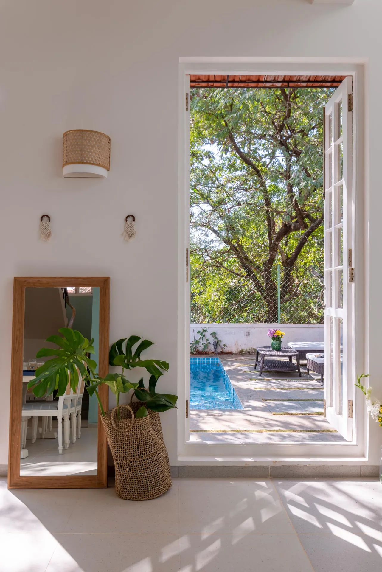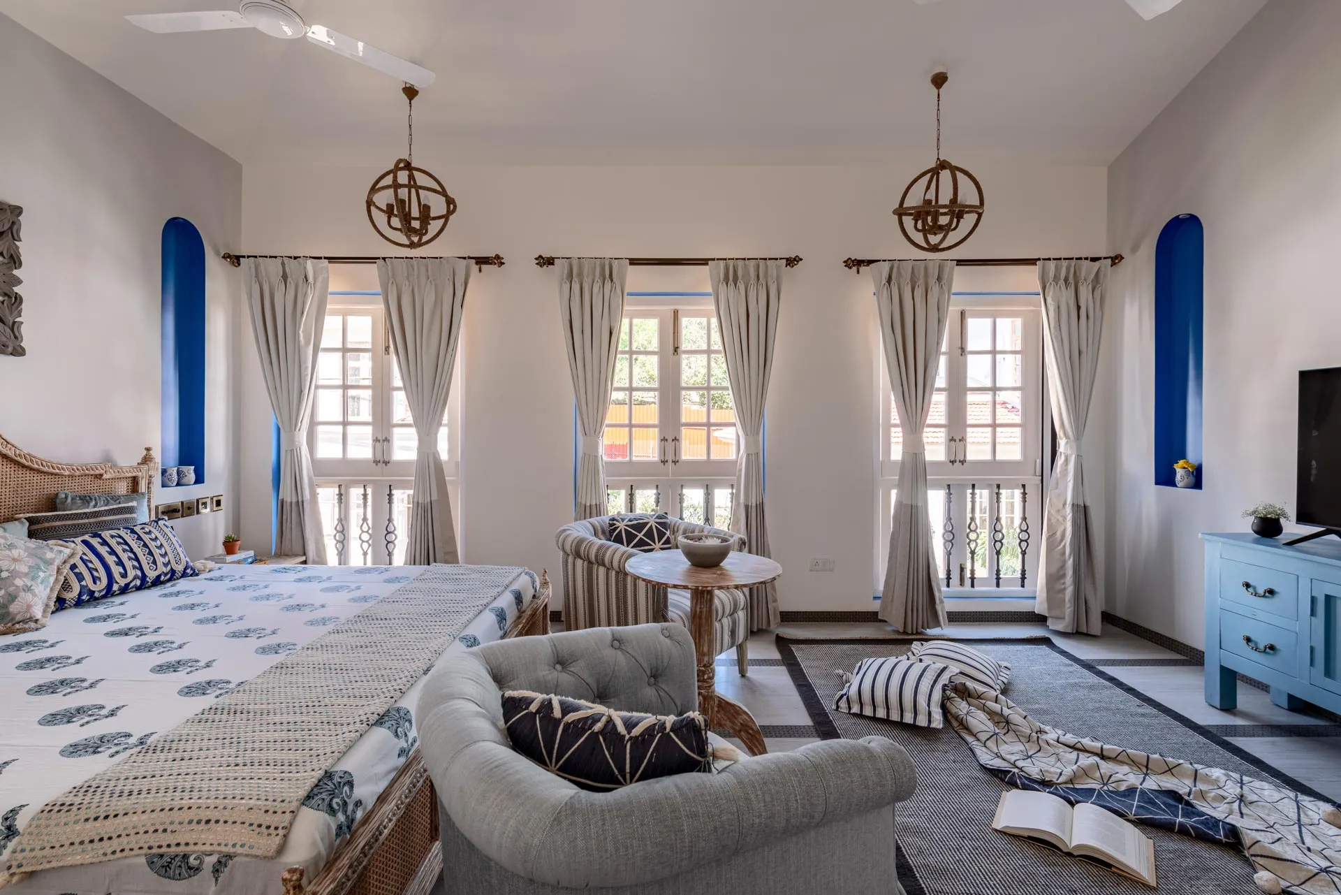 Villa D of Isprava’s gated community, Colina, exemplifies the Mediterranean design style and emphasises the indoor-outdoor living connect. The interiors are soothing with a primarily neutral grey-white colour palette, brought to life with blue accents. The large glass doors and windows of this Goan-Portuguese home, along with the stunning skylight in the living area, let in ample natural light and allow you to take in the lush green foliage. The dining area that opens out onto the private pool area, is perfect for a dinner soirée while the terrace, fitted with its own bar, is where you can enjoy your aperitifs. The 3 cozy bedrooms and den offer homely comforts and the best amenities for you to relax and unwind. Colina is truly a haven for city-dwellers. No two luxury homes here are alike and yet they maintain a beautiful sense of harmony. You can book multiple villas in the community for larger groups, while enjoying the privacy within your own villa. Conveniently located in Assagaon, Goa’s trendiest cafés and restaurants are right at your doorstep while the pristine beaches of Ashvem and Mandrem are just a short drive away.