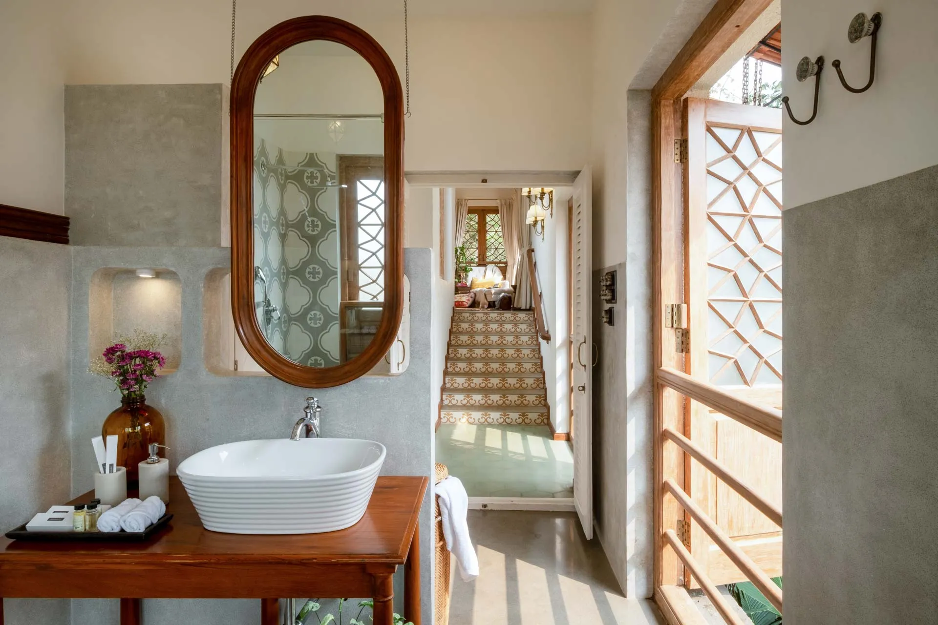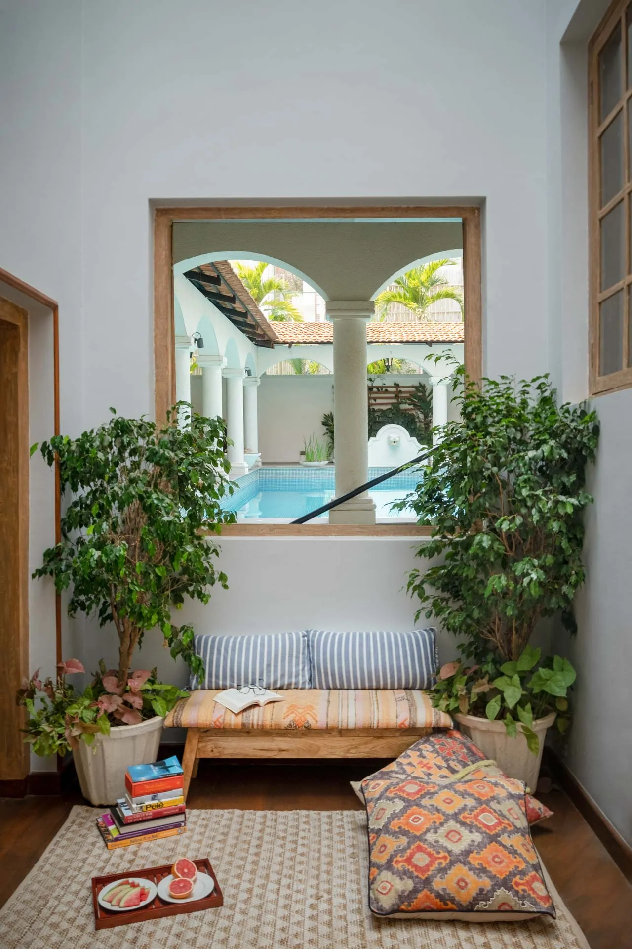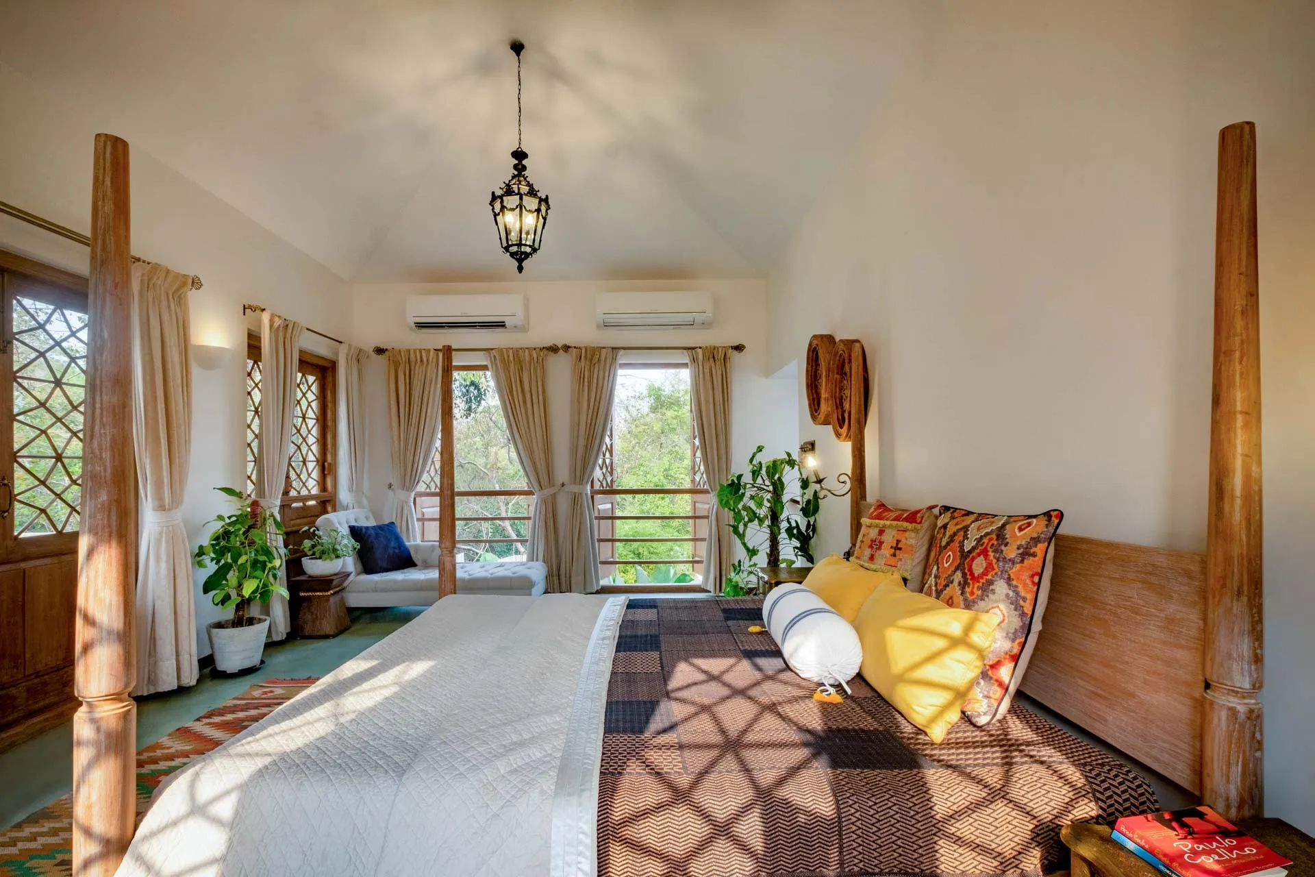 Villa E, part of Fonteira comprises of four bedrooms and a study room. Located in Assagaon, also known as “the Beverly hills of Goa”, the home is inspired by traditional Indian havelis. Bedrooms have ochre cane cabinets, brick-red tiles and wooden lattice work windows that make this home feel like a warm, welcoming space. Whenever you tire of lazing around in your poolside gazebo, head to the terrace for a meal under the stars.